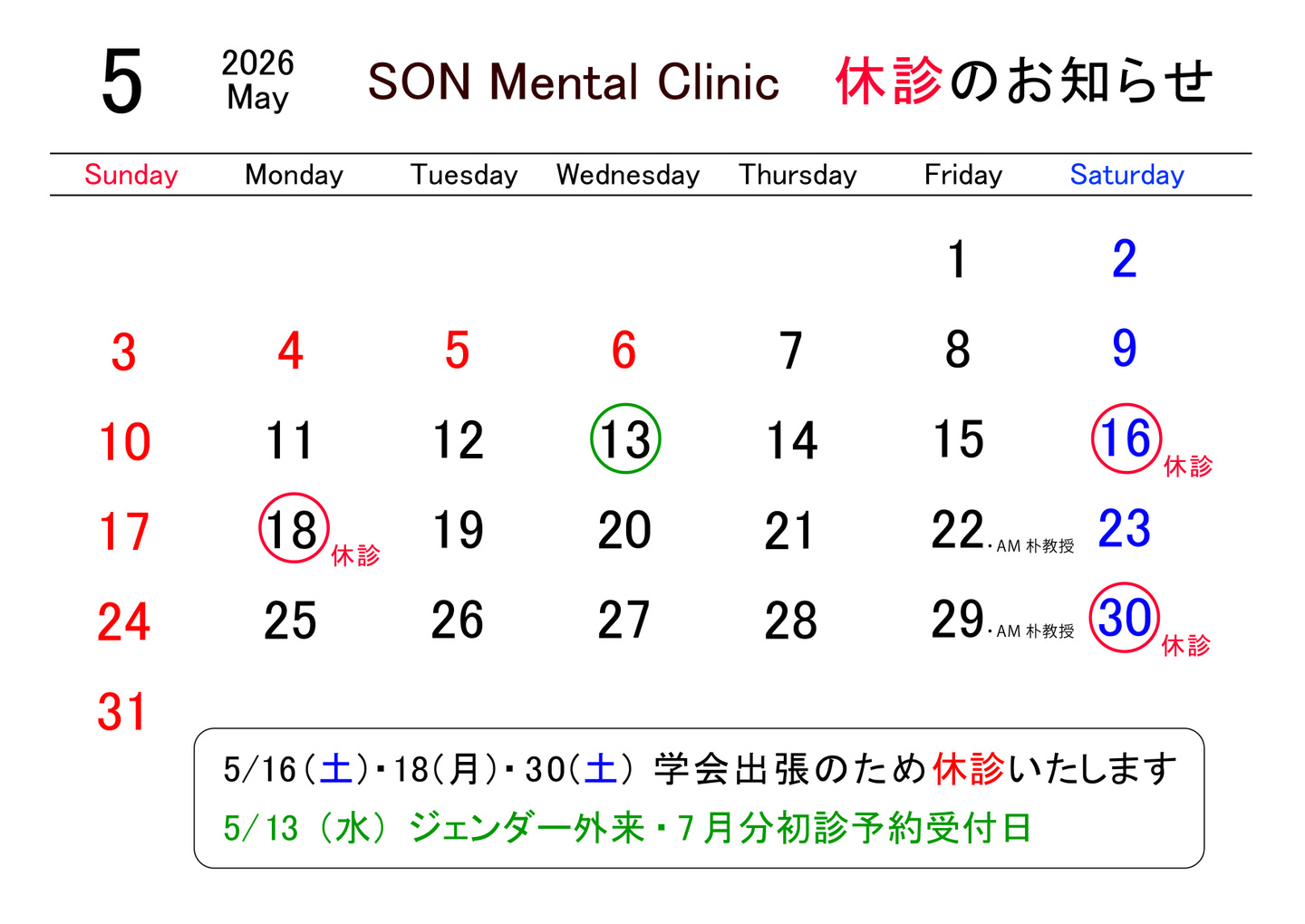 【5月 休診のお知らせ】